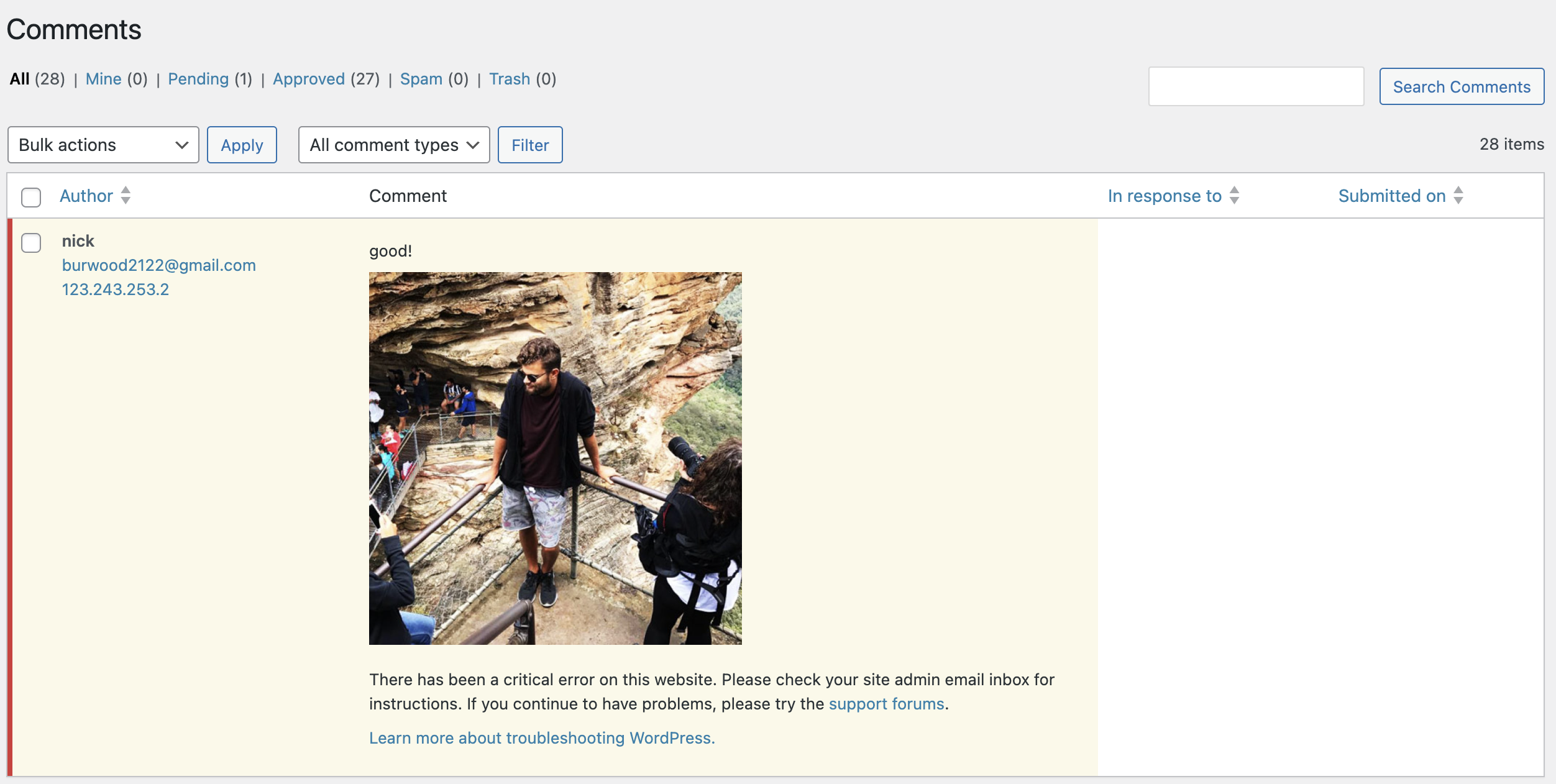Dear creator of DCO Comment Attachment, I tried to use a plugin to allow users to upload pictures in their comments, but it doesn’t work on my website: the pictures don’t show up, and there’s an error code on the approval page. If you have time, please guide me on how to solve this problem. Thank you very much! Nick