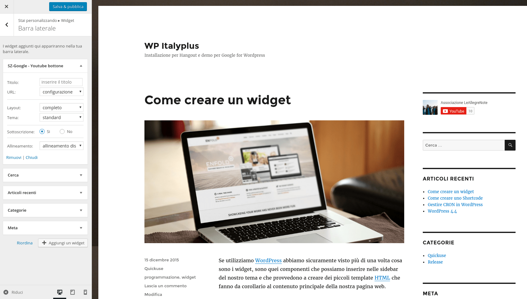 Salve, oltre quanto richiesto nel thread YOUTUBE BADGE segnalo che con la versione attuale di wp (4.5) il plugin, quando attivato, non permette più di accedere alla parte personalizzazione del tema.