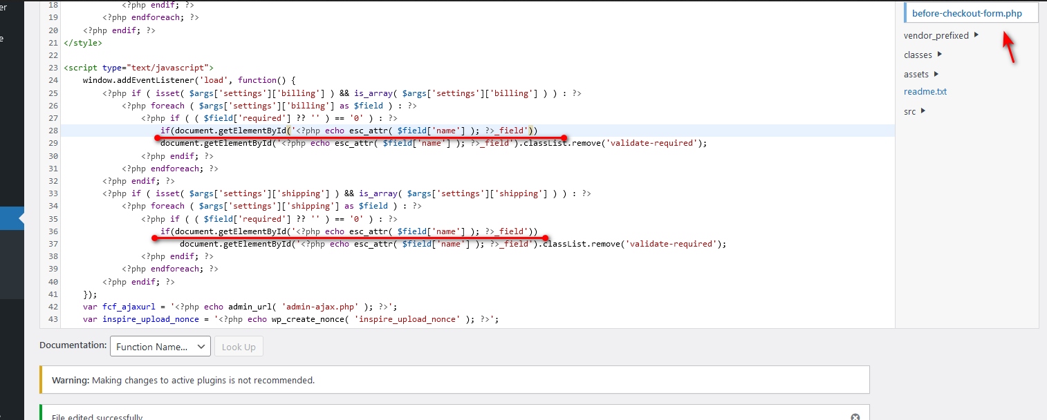 JavaScript is rendered for fields that are not present. This means that errors of type specified below occurs. The action in question is classes/plugins.php/woocommerce_before_checkout_form()