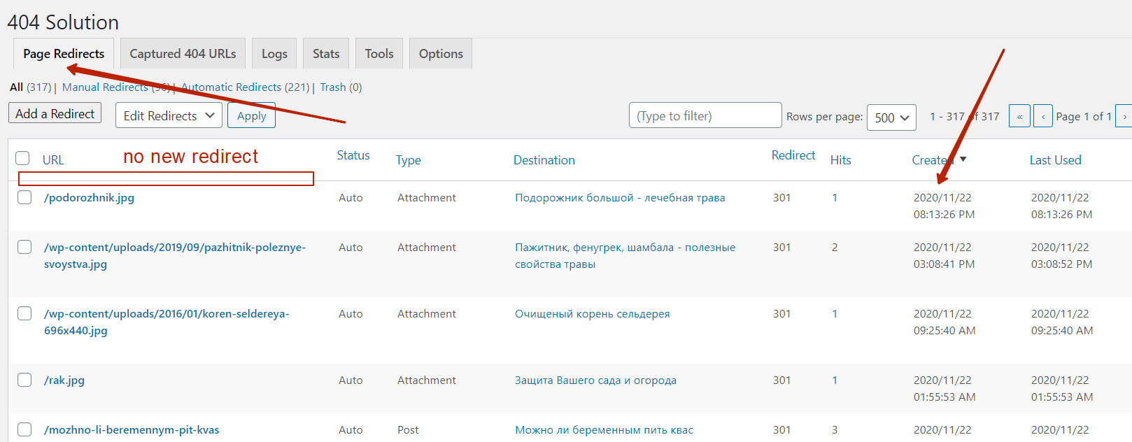 If you can’t see the redirect you created, maybe try ordering by the “Created” column so that it has a downward pointing arrow. Then the most recently created redirect will appear at the top.