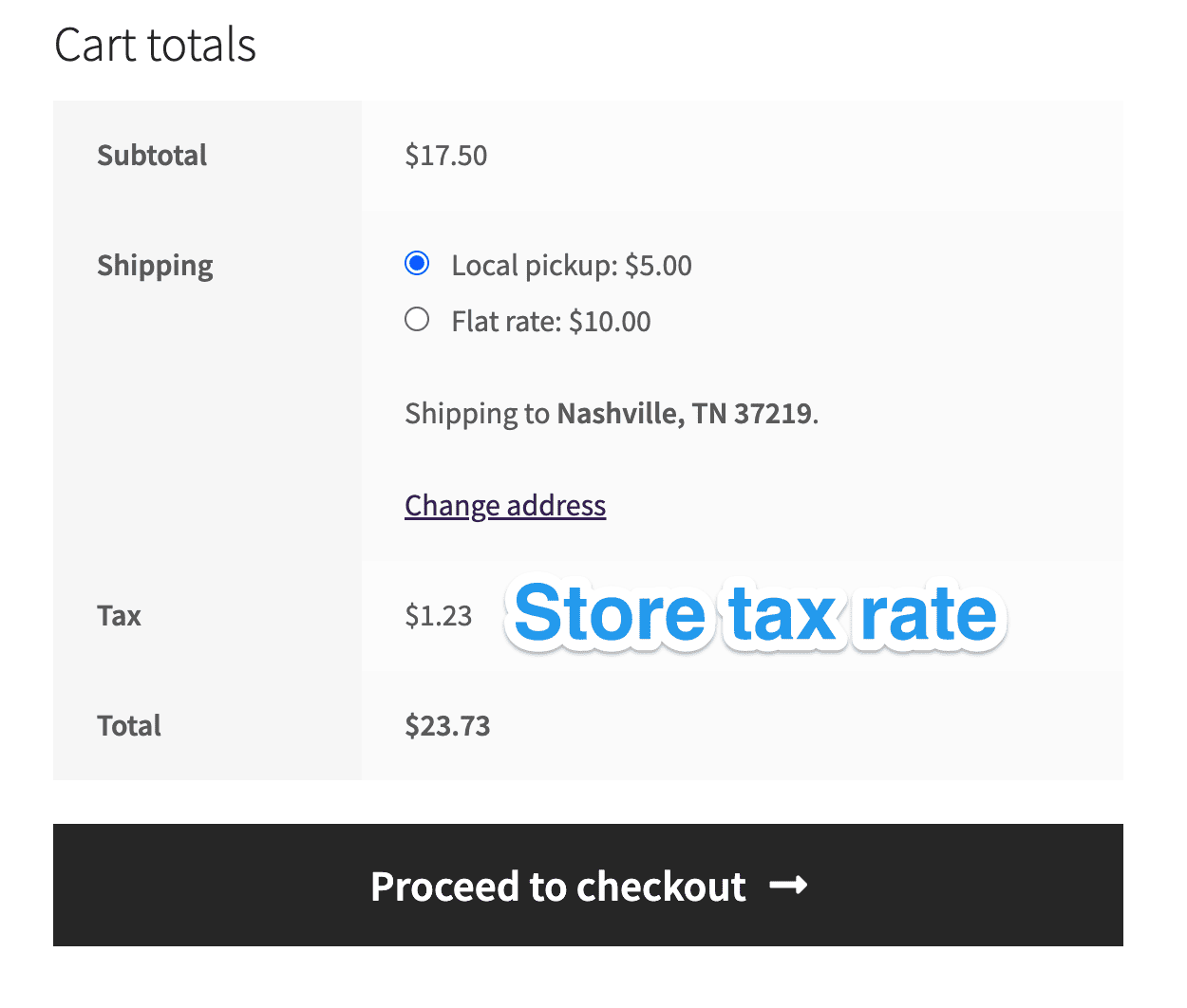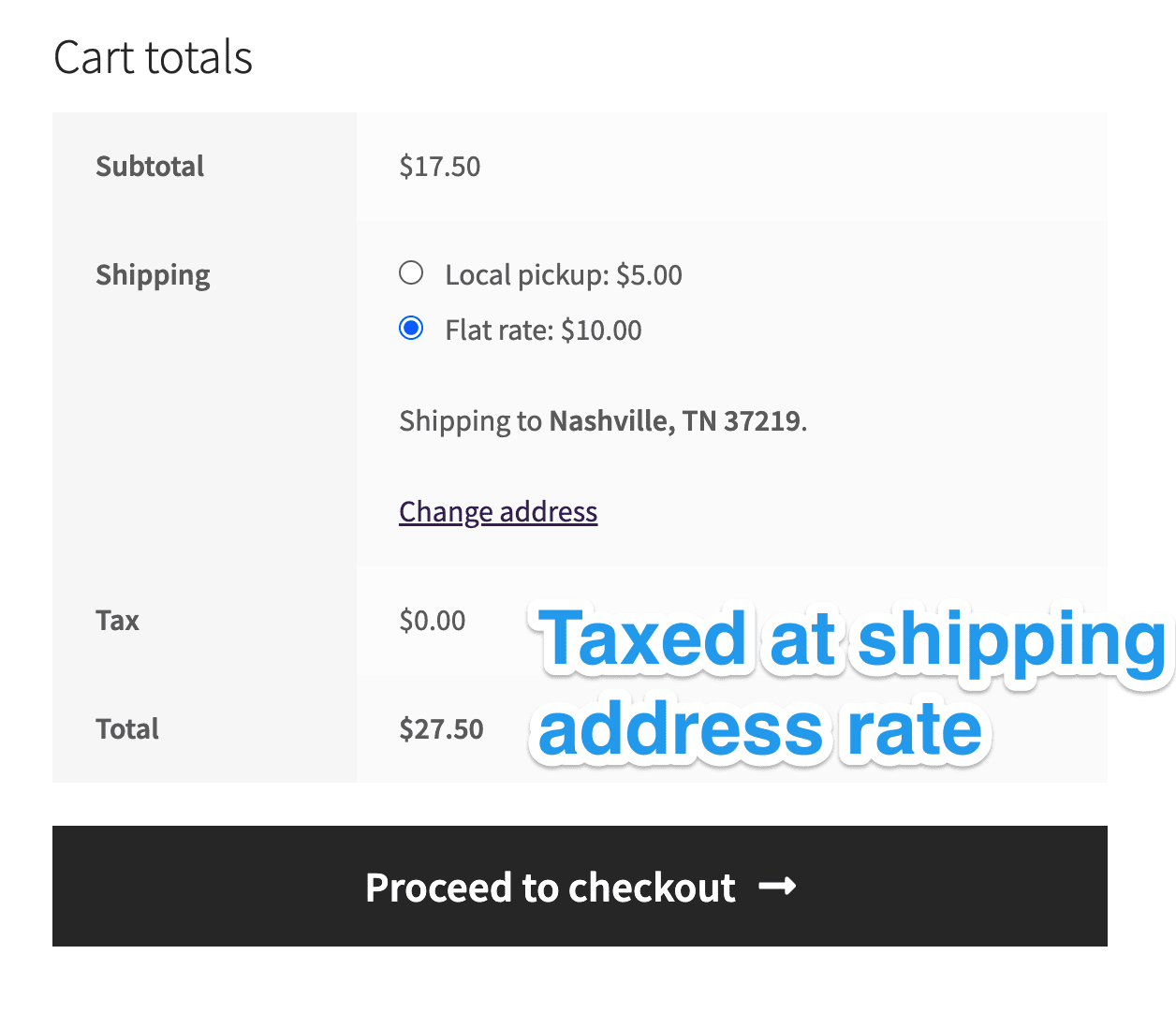 Here are two screenshots from my test site showing how this should work. Nashville, TN is not taxable for the store’s location so it shouldn’t be charged at all.