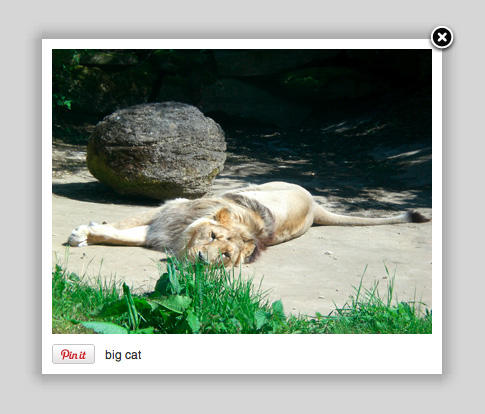 I’ve just coded you up a solution whereby you can display a Pinterest “Pin it” badge natively right inside Fancybox! I’ve used the “inside” title display to allow enough room for the button, and have passed it all the necessary metadata that will allow it to save your photos to the site.That said…I don’t actually have a Pinterest account to test the posting action. Perhaps you could invite me to join???