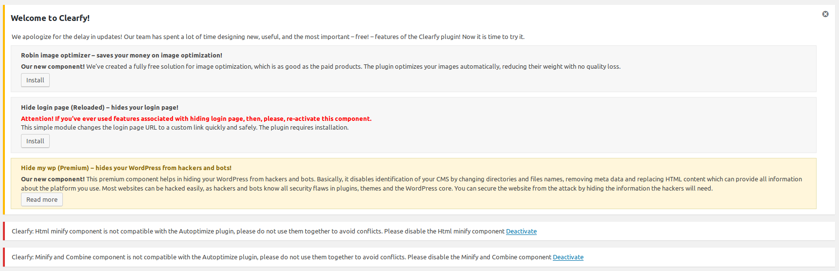 When I use Clearfy, on virtually every screen refresh in /wp-admin/ Clearfy admin notices take up half the vertical height of my screen. You can dismiss them, but they just come back. The notices are for try/buy other plugins, and two more notices complaining about Autoptimize…I disabled Clearfy’s optimization components, but I still get the notices. It’s really annoying. Although I’m a big fan of Clearfy, having those notices in my face all day is just about enough for me to uninstall it.
