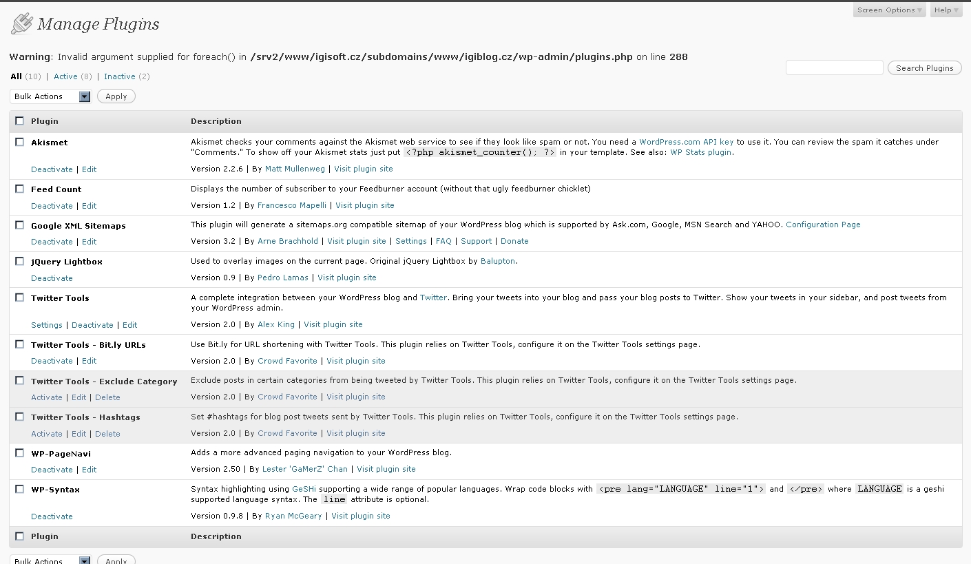 Warning: Invalid argument supplied for foreach() in /srv2/www/igisoft.cz/subdomains/www/igiblog.cz/wp-admin/plugins.php on line 288