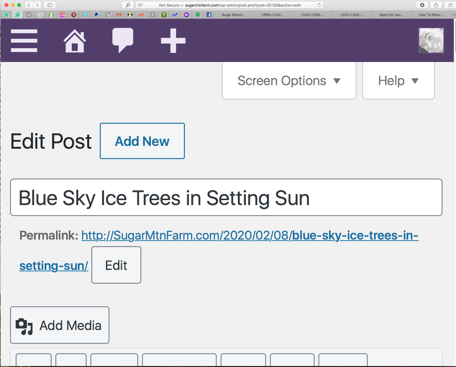 I created a new post, pressed publish and then suddenly WordPress looks like it things I’m on a mobile device like a phone. Everything is hugely enlarged.