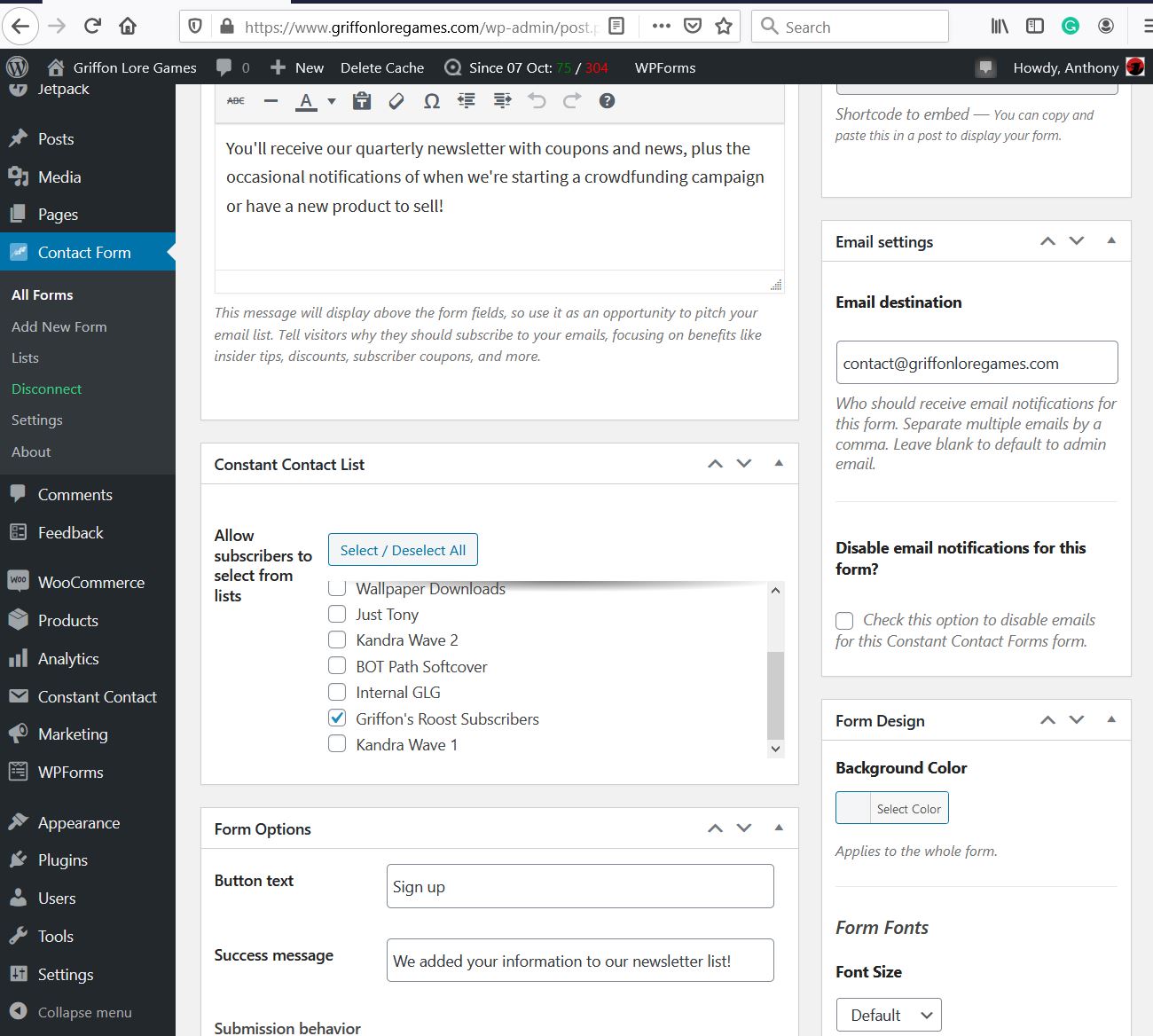 3) When I created a new form, I didn’t pick anything in the “Allow subscribers to select from lists”, thinking that was a choice made somewhere else. When I tested the form, it accepted the email with a success message, but it had no list associated, so it went nowhere. Only when I went back and said, “Hey, I wonder if that is just a bad UX,” and I re-picked the newsletter list did it start adding emails to the correct list (of course).