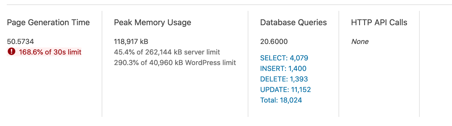 4. Query monitor doesn’t show any slow queries, but shows thousands and thousands of queries on pages with the slow loading. Here’s an example of loading the “All Posts” page for the default post type: https://img-33.s3-us-west-1.amazonaws.com/2021-06-14-at-10-35-37.png. As you can see – over 50 seconds to load the page, with 18 thousand queries.