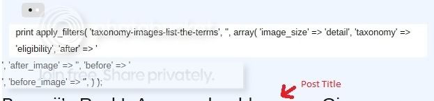 if( $wp_query->have_posts() ) : while( $wp_query->have_posts() ) : $wp_query->the_post(); $catalyst_loop_count++; $more = 0; ?> <div <?php post_class(); ?>> print apply_filters( 'taxonomy-images-list-the-terms', '', array( 'image_size' => 'detail', 'taxonomy' => 'eligibility', 'after' => '</div>', 'after_image' => '</span>', 'before' => '<div class="icon">', 'before_image' => '<span>', ) );And what I see on the page is this: